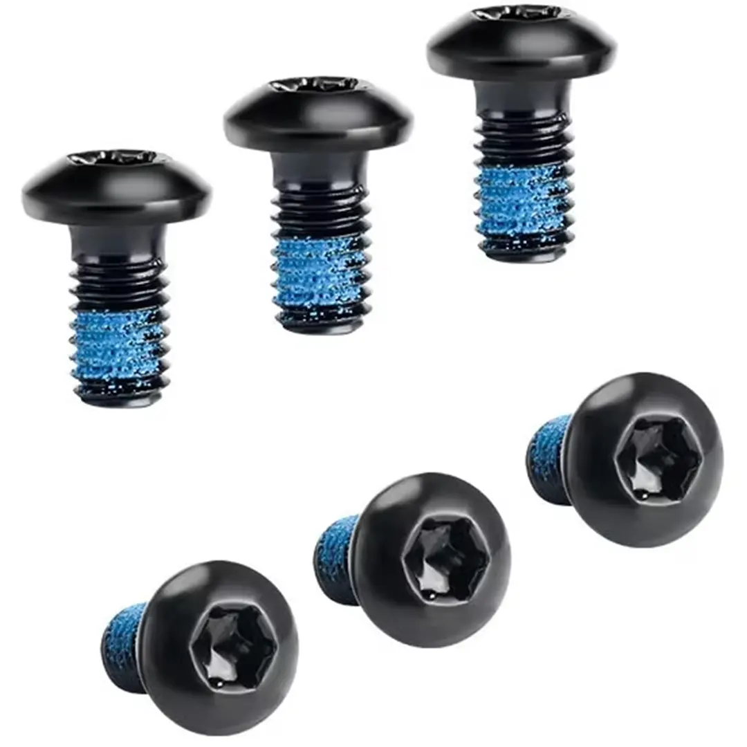 Pernos para discos de freno de bicicleta con fijación Torx T25. El hilo de cada tornillo contiene trabapernos azul para mejorar fijación. Cada pack contiene 6 unidades.